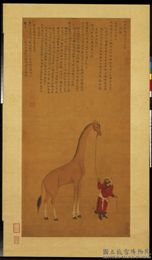 现藏台北故宫博物院的绢本设色《画麒麟沈度颂》呈现了这样一幅画面,明永乐十二年(公元1414年)榜葛剌使者入贡,带来了新国王的致意。贡品中的这头长颈鹿,当时被称为“麒麟贡”,因为画工的精湛技艺,形象留存至今。
