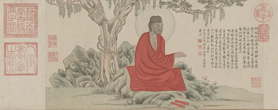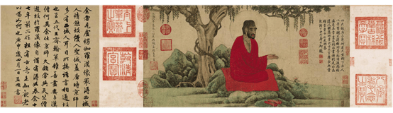 这幅画既有唐人绘画的面貌,又反映了元大都东西人员往来密切的现实。作为赵宋宗室的赵孟頫,无论是出于文化还是政治因素考虑,自然有一番缱绻怀恋。但即使如此,他也承认“至中国不绝”的西蕃上师中,也有“德业隆盛,人天归敬”如胆巴这样的人[7]。站在今人的角度来看,无论是赵还是胆巴,事实上都成为了文化与宗教汇集交融的使者。到了清代,红衣罗汉的主题更是反复出现在宫廷美术中。乾隆皇帝热爱“摹古”,而古典主义宗师之一的赵孟頫,正是他乐于模仿的对象,他本人亦曾以类似笔触和风格,仿上述红衣僧人肖像作品。