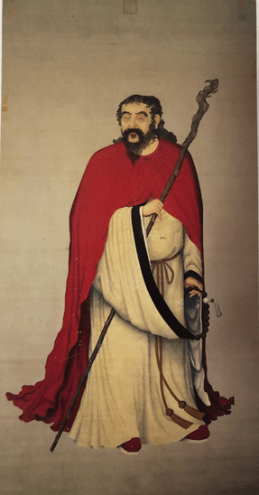 红衣僧人/罗汉的母题在乾隆朝宫廷中的另一番呈现,则推台北故宫所藏一幅油画像。这幅作品不再是传统书画名家或者是皇帝御笔创作,而是西来耶稣会士的手笔。从人物面容和装束来看,除了保留红色罩袍以外,基本不再具有蕃僧的特征,而是西洋教士的打扮,只能从拄杖与念珠依稀辨识出罗汉的身份。同时,这张油画以高丽纸代替了画布,又混合使用中西颜料,削弱了西洋艺术中人物肖像的光影浓淡对比,也改西洋画中常见的侧面光为正面光。因此这一版的“番僧”,虽然某种程度上变革意味更加鲜明,却依然寻得着中国艺术的根脉。