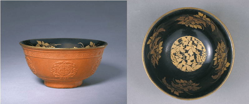 文化的“出口”-“进口”,转换之间复杂的交互影响在漆艺史上亦有体现。中国漆器千年以前即远播日本。天平时代输入日本的唐代莳绘[11],在9世纪开始呈现自己的风格与道路,到18世纪再传回清代中国。雍正朝宫廷器物如匏器、木器上,大量呈现这种黑底描金“仿洋”工艺。喜欢沉稳凝重风格的雍正帝,十分青睐东来的这种色彩搭配。[12]从日本到中国,这是另一种“东风西渐”。和式的工艺与纹样,因着中国皇帝的喜爱而在宫廷中流行起来。